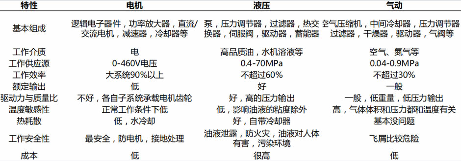 液壓、電機(jī)和氣動(dòng)驅(qū)動(dòng)方式各有特點(diǎn),其中電機(jī)驅(qū)動(dòng)為傳統(tǒng),技術(shù)進(jìn)步迭代速度快,應(yīng)用范圍廣;