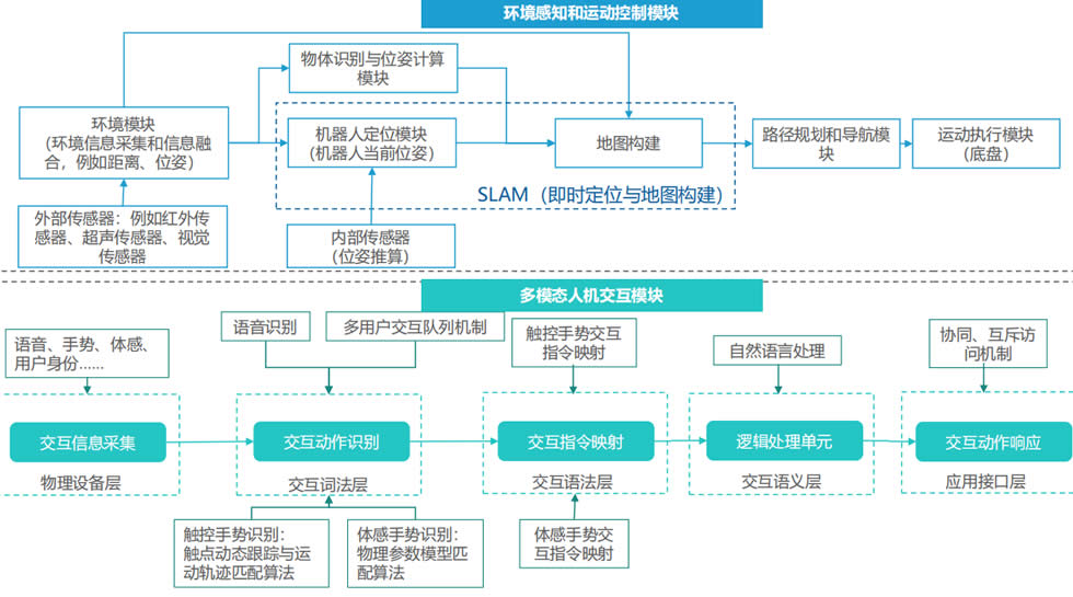 環(huán)境感知與導航是指機器人通過傳感器獲取外界環(huán)境及自身信息;運動控制器是服務(wù)機器人行動的執(zhí)行者;人機交互技術(shù)是實現(xiàn)服務(wù)機器 人與人溝通的橋梁
