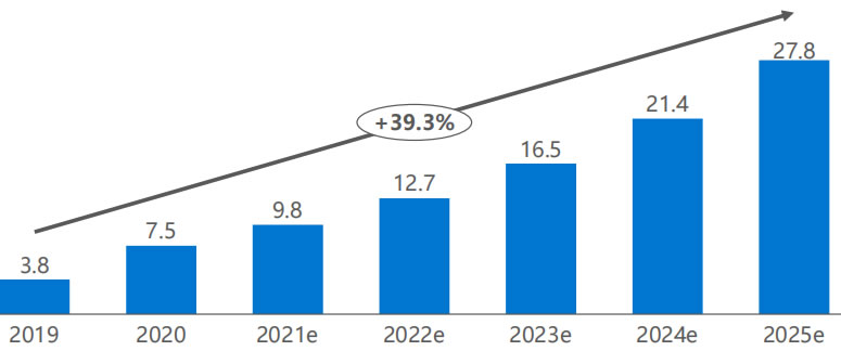 受新G疫情的防疫需求帶動,加之清潔行業(yè)長期面臨招工難、人力成本G等 痛點,商用清潔機器人的市場需求愈發(fā)旺盛。特別是具備智能消毒功能的清 潔機器人,通過集成消毒液自動噴灑系統(tǒng),實現(xiàn)全域噴霧消殺,可以有效降 低人力工作強度和交叉感染風(fēng)險,已在地鐵站、機場、辦公區(qū)、展館、酒店 等場景加速落地應(yīng)用。在需求驅(qū)動下,商用清潔機器人的市場規(guī)模快速增長。 2019年中國商用清潔機器人的市場規(guī)模約3.8億元,預(yù)計2021年將達到9.8 億元,2025年將達到27.8億元,年復(fù)合增長率約39.3%*。