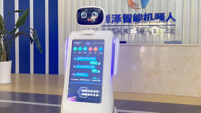 進入園區內的展廳,可以遇到一臺服務接待機器人“創創”。