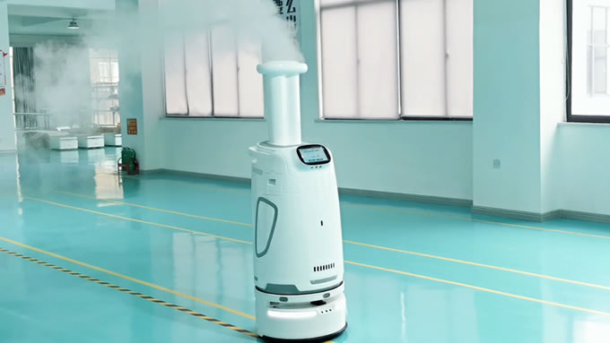 消毒機器人使用霧化噴霧、紫外線燈雙重途徑消毒滅菌,是保證隔離點各個死角、空氣安全性的強力護衛。微米級霧化裝置搭配環繞式紫外燈,可以實現360度無死角自主消殺。