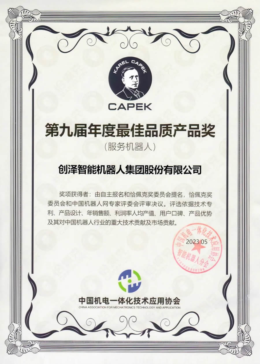 創(chuàng)澤集團(tuán)作為商用服務(wù)機(jī)器人行業(yè)L軍企業(yè),受邀參加本次G峰論壇。憑借多年在人工智能服務(wù)機(jī)器人L域深耕的綜合實力、創(chuàng)新技術(shù)和豐富的項目落地案例,實力斬獲恰佩克“第九屆年度佳品質(zhì)產(chǎn)品獎”。