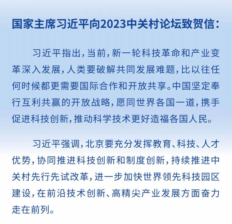 2023中關(guān)村論壇由科技部、國(guó)家發(fā)展改革委、工業(yè)和信息化部、國(guó)務(wù)院國(guó)資委、中國(guó)科學(xué)院、中國(guó)工程院、中國(guó)科協(xié)、北京市政府共同主辦,25日在北京開(kāi)幕。 政治局委員、北京市委書(shū)記尹力在開(kāi)幕式上宣讀了主席的賀信。政治局常委、國(guó)務(wù)院副總理丁薛祥出席開(kāi)幕式并致辭。 丁薛祥指出,主席專門(mén)發(fā)來(lái)賀信,充分體現(xiàn)了對(duì)科技創(chuàng)新和國(guó)際合作的G度重視。新時(shí)代十年,中國(guó)把科技創(chuàng)新擺在國(guó)家發(fā)展全局的核心地位,推動(dòng)科技事業(yè)發(fā)展取得顯著成就,進(jìn)入創(chuàng)新型國(guó)家行列。