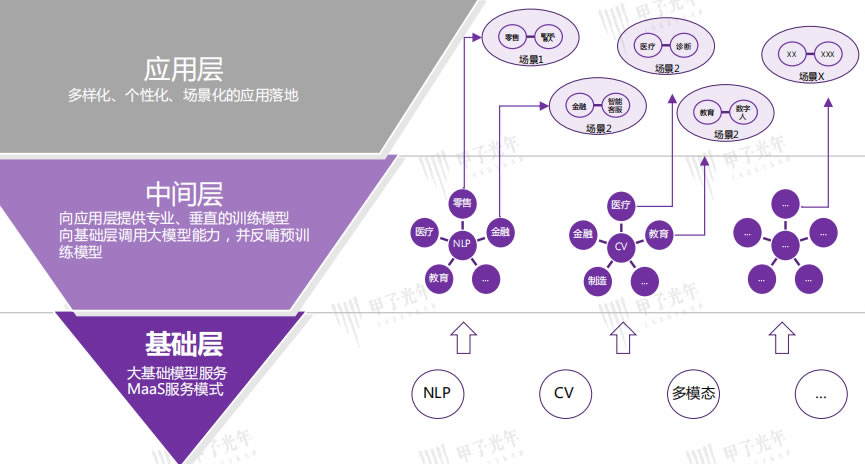 三層,變化為芯片層、框架層、模型層和應(yīng)用層四層,其中模型層中會(huì)出現(xiàn)中間層、應(yīng)用